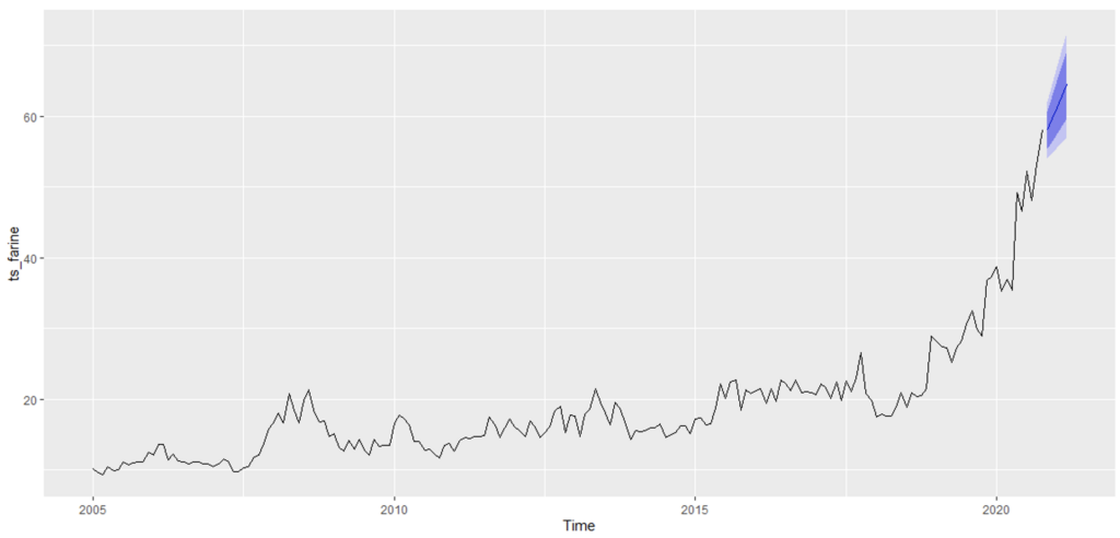 Al analizar la tendencia y los cambios del precio en los alimentos anteriormente mencionados, los estudiantes realizaron predicciones para estas tendencias hasta el final del año fiscal. La Figura 1 muestra los resultados del pronóstico que un grupo de estudiantes de la clase realizó sobre el precio de otro alimento: la harina. Estas estimaciones cuantitativas se utilizaron para discutir y reflexionar sobre posibles intervenciones que podrían mitigar el impacto del aumento de los precios de los alimentos, y se identificó información que resulta útil para actores como el BID, donde se trabajan en estos temas dentro del país. Nota: los resultados de la estimación presentados en este blog no reflejan la visión del BID ni de la CTPEA.