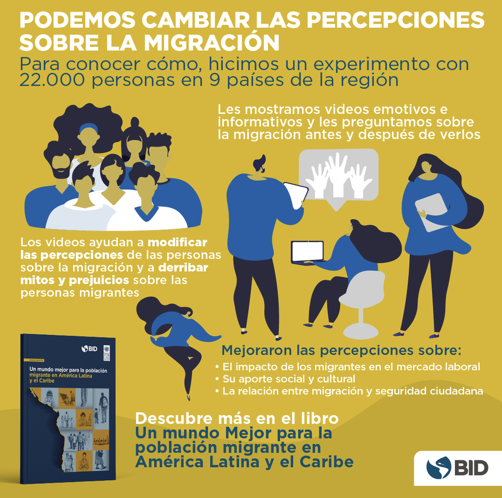 La buena noticia es que se puede hacer algo al respecto. Un estudio entre el BID y el PNUD, que incluyó a 22,000 personas en Barbados, Chile, Colombia, Costa Rica, Ecuador, México, Perú, República Dominicana y Trinidad y Tobago, logró demostrar que es posible mejorar la percepción de las personas hacia la migración y contribuir a derribar prejuicios asociados a las personas migrantes.