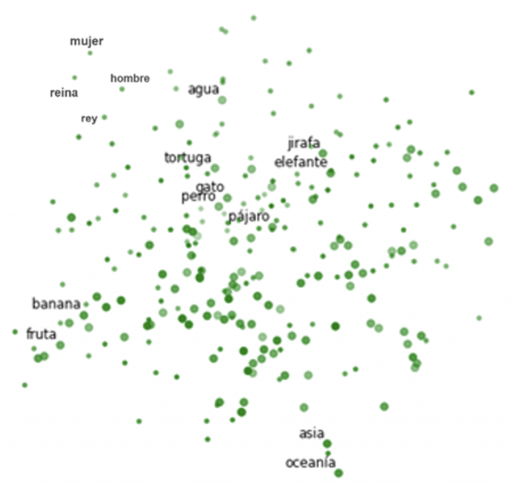 Imagina una nubeen el espaciocompuesta porpalabras. En esta nube, el lugar donde se encuentran las palabras es importante ya que determina su significado. Comovemos en la imagen arriba, la cual es una visualización de esta nube,tenemos en una sección palabras asociadas a animales y en otra encontramos palabras asociadas a alimentos.Dentro del grupo de palabrasdeanimales, también vemos que las palabras asociadas a mascotas se encuentran más cercanas entre ellas, ej. gatoy perro,en comparación con las palabras que hacen referencia aanimales salvajes, ej. jirafa y elefante.No solo eso, en la imagen podemos observar otro tipo de patrones, por ejemplo, vemos que la distancia entre las palabras hombre y rey, es la misma que la distancia entre las palabras mujer y reina.