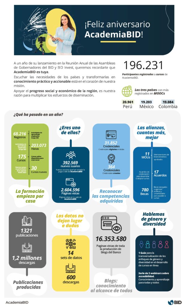 Es cierto que nos complace hablar de resultados y compartir lo que hemos logrado a solo un año de haber implementado una plataforma tan ambiciosa y completa como AcademiaBID, sin embargo, el mensaje que reiteramos es la invitación a descubrir y aprovechar el contenido y las herramientas disponibles en ella. ¡Las puertas están abiertas! AcademiaBID recibe con gusto a todos los interesados en formar parte del desarrollo de la región tan rica y prometedora que es América Latina y el Caribe.