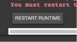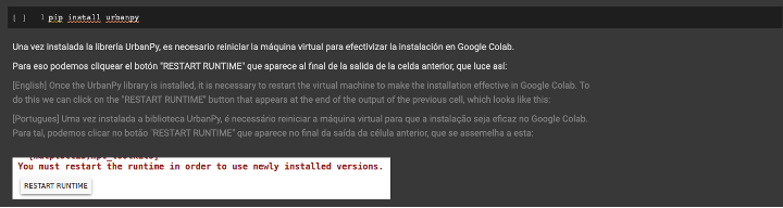 En el caso de esta primera célula, la documentación nos dice que cuando finalice su ejecución reiniciemos el runtime para que UrbanPy pueda ser instalado correctamente en el servidor. Ahora es necesario dar clic al botón “RESTART RUNTIME”