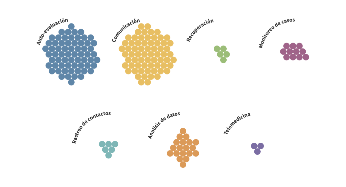 Se encontraron más de 530 apps en el mundo diseñadas exclusivamente para dar respuesta al COVID-19, de las cuales 85 son de la región. El análisis de las aplicaciones fue realizado con base en los tipos de intervenciones que define la OMS para la preparación y respuesta en la pandemia, y se encontraron que dichos desarrollos digitales se encuentran en las siguientes categorías:
