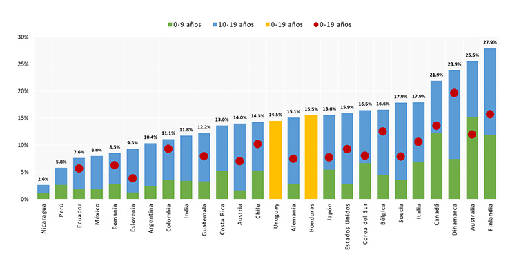 Fuente: Construcción propia con información disponible del Ministerio de Salud de Argentina, Ministerio de Salud Pública de Ecuador, Ministerio de Salud Pública y Asistencia Social en Guatemala, Instituto Nacional de Salud en Colombia, Observatorio Geográfico en Salud en Costa Rica, Ministerio de Salud en Chile, Centro de Información sobre Desastres y Salud en Honduras, Tablero de COVID-19 del Consejo Nacional de Ciencia y Tecnología en México, Observatorio Ciudadano de COVID-19 en Nicaragua, Ministerio de Salud en Perú y Ministerio de Salud en Uruguay. También del Centro para el Control y la Prevención de Enfermedades (CDC) en Estados Unidos y Statista para información del resto de los países.Notas: La mayoría de los países presentan información desagregada por edad al 15 de diciembre de 2021 o al 7 de enero de 2022, a excepción de los siguientes países: Bélgica (junio 15, 2021), Dinamarca (junio 15, 2021), Eslovenia (noviembre 22, 2021), India (octubre 18, 2021), Japón (noviembre 8, 2021), México (octubre 6, 2021), Nicaragua (noviembre 24, 2021), Rumania (octubre 14, 2021) y Uruguay (julio 12, 2021). En cuanto a los grupos de edad, países como Eslovenia, Austria y Alemania reportaron sus cifras para niños de 0-4 y de 5-14 años. En Ecuador de 0-10 y de 11-20 años. En Estados Unidos de 0-4 y de 5-17 años. En Canadá de 0-11 y 12-19 años. En India de 0-10 y 11-20 años. En Uruguay de 0-15 años. Honduras de 0-20 años.
