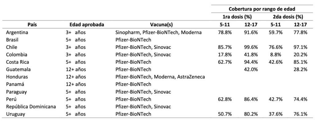Un número creciente de países de ALC han aprobado el uso de vacunas contra el COVID-19 y han empezado a vacunar a niños mayores de 5 años. Si bien la mayoría de los países han aprobado la vacuna Pfizer-BioNTech, otros, como Argentina, Chile, Colombia, Paraguay, Honduras y República Dominicana, han aprobado también las vacunas Sinovac, Moderna, AstraZeneca y Sinopharm. No obstante, faltan datos más precisos sobre las tasas de vacunación en niños. Para aquellos países con información detallada, observamos variabilidad en la cobertura.