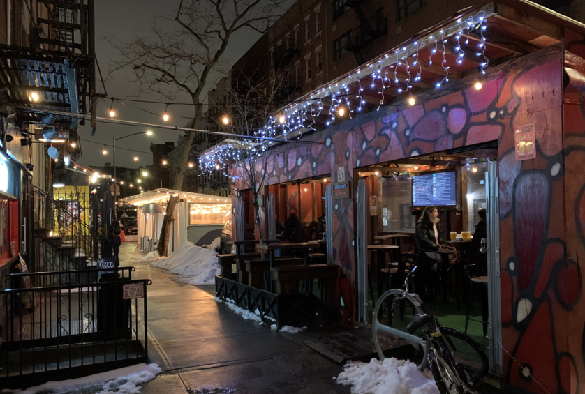 Los restaurantes se apropian las aceras de Nueva York durante el invierno. Foto: Andreina Seijas- Considerar el tiempo como una alternativa de distanciamiento social. Las restricciones horarias han tenido un impacto negativo sobre la vitalidad de las ciudades durante la pandemia: Berlín tuvo su primer toque de queda desde 1949 y el metro de Nueva York dejó de funcionar 24 horas por primera vez en su historia. El tiempo, al igual que el espacio, es una herramienta útil para gestionar temas como la congestión y el ruido en zonas de gran concentración de establecimientos culturales y de entretenimiento. En lugar de promover una misma hora de cierre para todos los establecimientos, ciudades como Ámsterdam otorgan licencias 24 horas a negocios ubicados en zonas de menor densidad, logrando diversificar la hora de cierre y estimulando distintos usos de un mismo edificio durante el día.