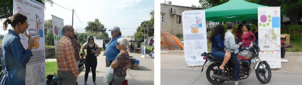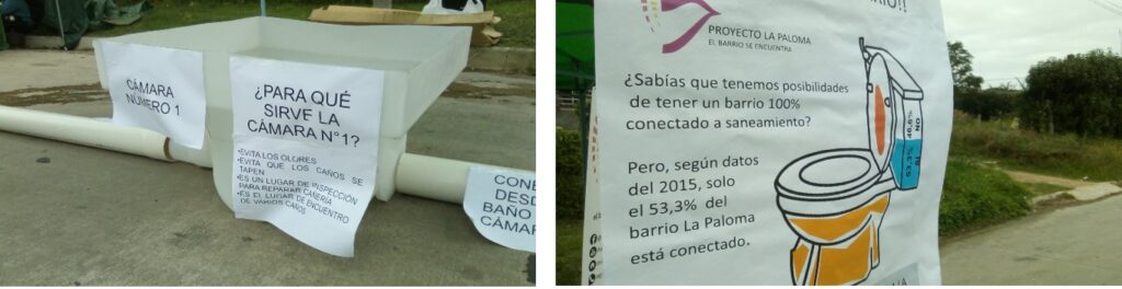 Se expuso una cámara de saneamiento en un lugar estratégico, mostrando las conexiones de los caños adecuados. También se realizó folletería y banners informando a la comunidad de las conexiones a saneamiento en su barrio, de sus ventajas y de la mejora sustancial que éstas producen en nuestra vida diaria.