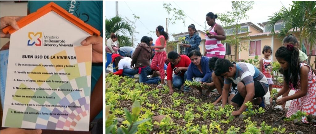 A nivel público, Ecuador, a través del Ministerio de Desarrollo Urbano y Vivienda (MIDUVI) implementó entre el 2012 a 2016 la Gerencia de Acompañamiento Social/Gerencia Social. Este plan tenía como objetivo apoyar proyectos de construcción de conjuntos habitacionales y reasentamientos que pudieran mejorar las condiciones de vida de la población beneficiaria. Para llevarlo a cabo, se capacitó a las familias en el buen uso de la vivienda y convivencia social. Así mismo, se trabajó en la creación de comunidades solidarias y autogestoras de su propio hábitat, como en la coproducción de planes de acción comunitaria y acuerdos de convivencia.