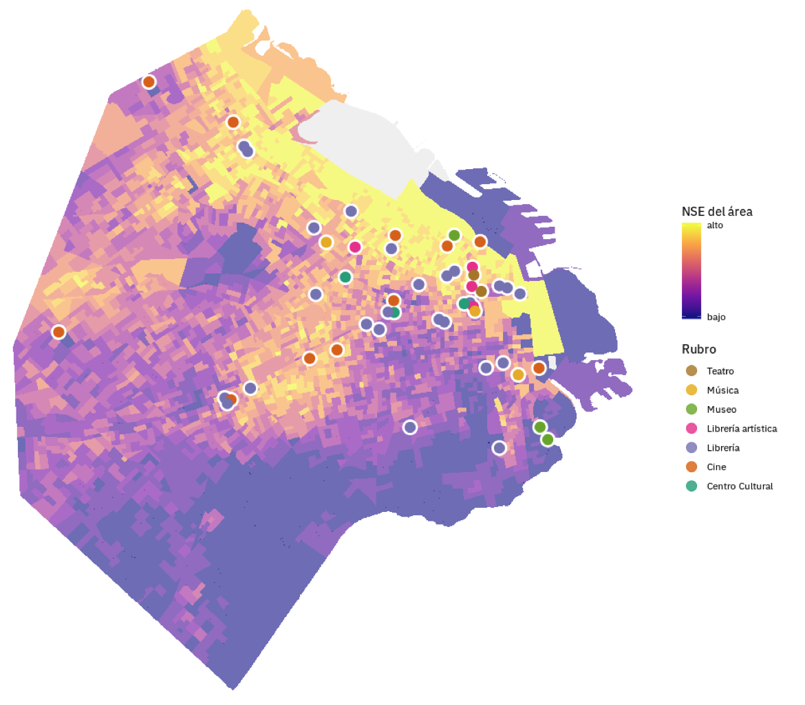 Fig.2 Resumen de preferencias, en la primera columna la primera elección seguida por las columnas que siguen a la derecha. Siendo la cuarta columna las opciones no elegidas.La fuerte tendencia al uso del Pase Cultural exclusivamente para cine, encontrada tanto en encuestas como en los datos sacados de las transacciones del pase, nos invita a revisar el Pase Cultural francés, que incorpora un algoritmo para ofrecer a los usuarios sectores de la cultura disímiles-que ya ha sido utilizado. Acompañando a los usuarios a una ampliación de sus experiencias culturales para determinar sus preferencias y gustos a partir de la variedad de opciones disponibles, en vez de asistir continuamente sólo a lo que ya conocen previamente.El Pase Cultural cuenta con 15.922 registros entre diciembre de 2018 y septiembre de 2019. Mostrando relación entre origen y destino, frecuencia y tipo de uso, y perfil del beneficiario. La aplicación de: "R", el lenguaje de programación especializado en análisis de datos, permitió descubrir y hacer un análisis de correlación que resumiremos a continuación.La georreferenciación evidencia que la oferta cultural está concentrada en el área centro norte de la ciudad de Buenos Aires (ver mapa de la figura 3). Este mapeo resalta que los deciles más bajos tienden a concentrarse en la zona sur de la ciudad y que la oferta en la zona centro-norte se atribuye a lugares con ventajas socioeconómicas. Este programa tiene entonces el desafío de lograr mayor oferta cultural en el sector sur, por medio de alianzas locales, facilitando el acceso equitativo a la oferta cultural gratuita. El Programa podría articularse mayormente con las iniciativas de impulso al desarrollo del Sur, por ejemplo, con el distrito de las Artes en el barrio de La Boca y sectores de San Telmo, el Distrito del Diseño en Barracas, entre otros.