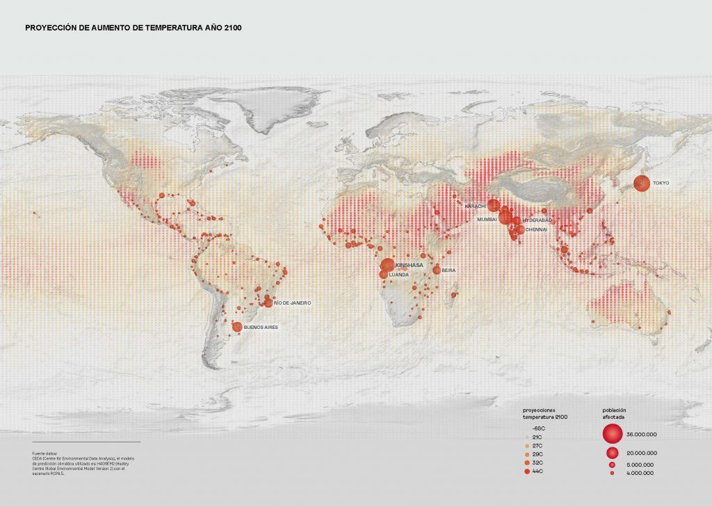 Figura 3: Proyecciones de aumento de temperatura al año 2100. Infografía publicada en Felipe Vera, Jeannette Sordi. (2021), P. 38-39.En los últimos años se han hecho importantes avances en repensar la ciudad informal. Desde el punto de vista teórico, se ha definido una terminología que acepta la naturaleza espontánea, cinética, popular y no formal de los asentamientos. Desde el punto de vista práctico, se han desarrollado estrategias de intervención para mejorar la calidad de vida, la seguridad y las oportunidades de sus habitantes. Hoy es fundamental incorporar de manera efectiva los criterios climáticos en las intervenciones urbanas.