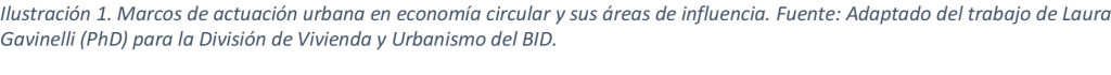 Este gráfico ilustra diferentes ámbitos de influencia en los que las ciudades pueden favorecer un sistema de innovación favorable para la economía circular. Pese a que la mayoría de ejemplos contundentes están en Europa, las ciudades de ALC también están desarrollando iniciativas al respecto, como en el caso de Providencia (Chile), Cuenca (Ecuador) y Hermosillo (México). Además, en un contexto de postpandemia, la economía circular puede servir como catalizador de empleos verdes y solventar problemas críticos de manejo de residuos y brechas de desarrollo urbano.