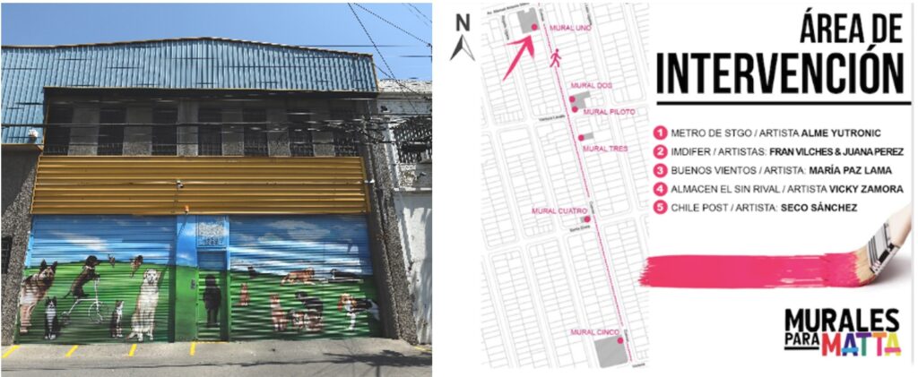 Ejemplo de murales y mapa del área de intervención en el barrio MattaUna de las necesidades que impulsó este proyecto fue la incompatibilidad de patrones de uso del barrio entre los vecinos y las grandes empresas que se establecieron recientemente en él. Muchas de estas empresas cierran sus puertas los fines de semana, lo cual hace que muchas calles se encuentren vacías y sin vida. Ante esta necesidad, se llevó a cabo una convocatoria para artistas locales a fin de intervenir estos portones y generar un espacio público para el disfrute de los vecinos, ayudando además a mejorar la percepción de seguridad en el área.