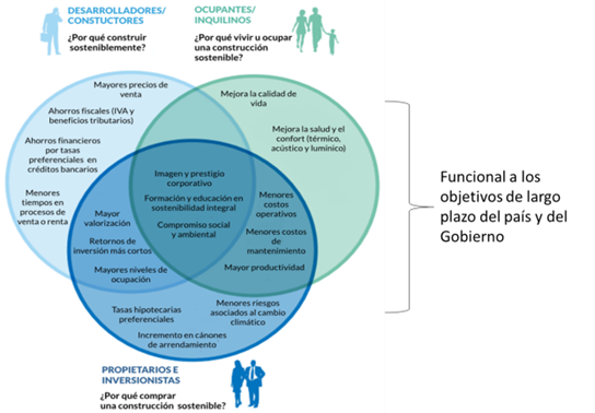 Un país que incentiva la vivienda sostenible, optimiza el uso de sus recursos naturales y económicos. Por un lado, las entidades financieras respaldarán proyectos con mejores garantías, disminuyendo riesgos ambientales y financieros. Por el otro, los constructores y promotores comercializarán de manera más eficiente sus proyectos de vivienda. Finalmente, los hogares y la sociedad en su conjunto mejoran su calidad de vida y se benefician de una operación más económica en el largo plazo, de los activos inmobiliarios construidos bajo los principios de sostenibilidad; atendiendo así, de manera más eficaz el déficit habitacional.