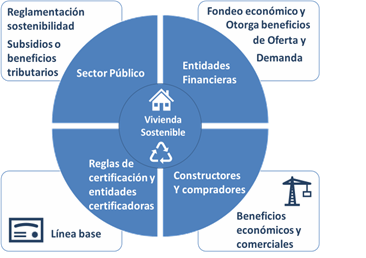La producción de vivienda sostenible requiere de un ecosistema que así lo exija, lo permita y lo incentive. La construcción de este ecosistema debe ser el resultado del apoyo de actores, tanto del sector público como privado, y de la sociedad civil. Algunos de ellos son: