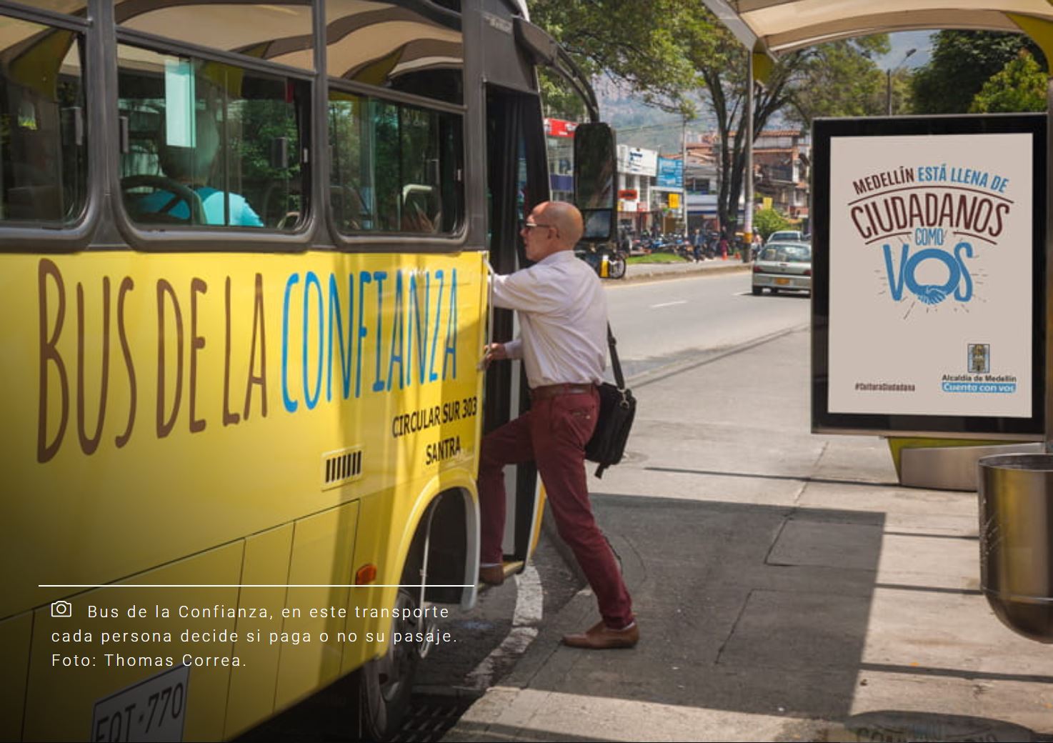 Esto lo logra a través de mensajes, actividades y escenarios de encuentrocomo la Tienda de la Confianza, el Bus de la Confianza y el Teatro de la Confianza, y ejercicios de reconocimiento y agradecimiento ciudadano como las Foto Cultas, las Cultas, las Serenatas para regalar y las Comparsas de agradecimiento. La Encuesta de Cultura Ciudadana 2017 arrojó que en Medellín nueve de cada 10 personas afirmaron sentirse orgullosos de su ciudad y ocho de cada 10 prefieren dialogar para resolver un conflicto o deciden pagar los impuestos a tiempo para que todos puedan tener acceso a servicios públicos.