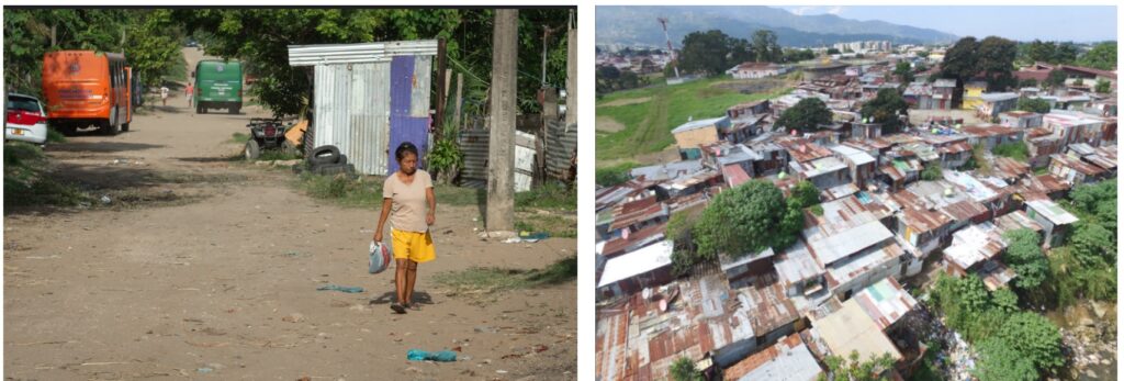 Los residentes de barrios informales son particularmente vulnerables a los peligros ambientales y los eventos climáticos. Por ejemplo, mientras que la recolección de residuos en ALC tiene una tasa de cobertura relativamente alto (90 %), solo unas pocas ciudades grandes, como Río de Janeiro, Ciudad de México y Buenos Aires, utilizan estaciones de transferencia para aguas servidas. A pesar de todo, en estas ciudades, las estaciones de transferencia apenas cubren menos de la mitad de su recolección. La mayoría de los desechos se depositan en vertederos a cielo abierto, lo cual es perjudicial para la salud de todos los habitantes y fuente de contaminación hídrica y de suelos . Los rellenos sanitarios mal administrados son particularmente dañinos para los barrios informales y las comunidades costeras. Además, estos barrios suelen estar ubicados en laderas, barrancos o riberas de ríos vulnerables a deslizamientos e inundaciones.