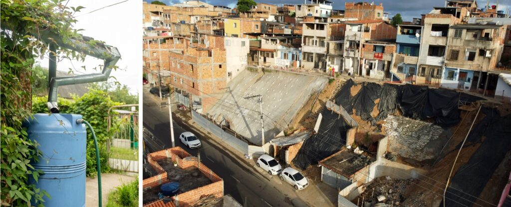 Izquierda: Sistemas de recolección de agua de lluvia para abordar el déficit hídrico en barrios vulnerables | Derecha: Muros de contención permiten mitigar riesgos en las laderas de los cerros