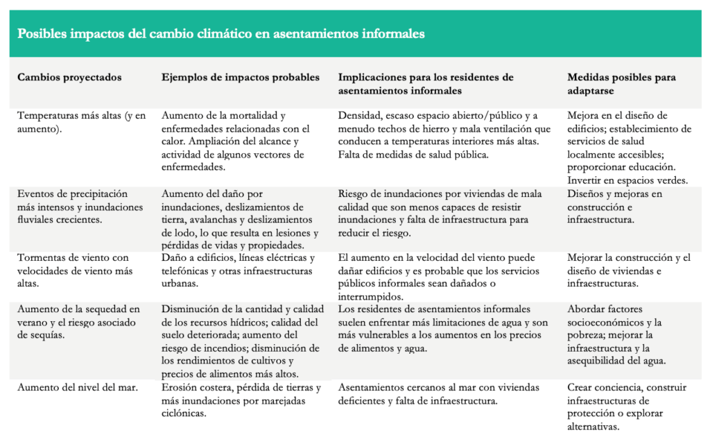 Extraído y traducido de: Addressing the most Vulnerable First - PRO-POOR CLIMATE ACTION IN INFORMAL SETTLEMENTS. UN-Habitat, 2018.