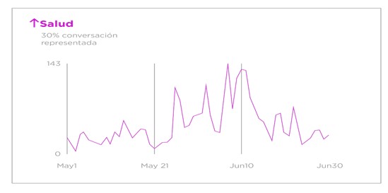 De forma paralela, a principios de junio de 2020 se detectó una gran afluencia de comentarios relacionados con la categoría de Salud, tal y como se puede apreciar en el siguiente gráfico. Los comentarios apuntaban a los inmigrantes como los principales propagadores del Covid-19. Esta conversación disminuyó tras el cierre de las fronteras.