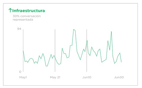 Otro problema identificado en este análisis involucró el tránsito de miles de migrantes de regreso a su país de origen desde principios de mayo hasta junio de 2020. Como resultado del éxodo, muchos migrantes realizaron asentamientos en espacios públicos y calles, además de provocar la saturación de los cruces fronterizos. Toda esta actividad agravó el problema de infraestructura y — como se observa en el gráfico a continuación — generó comentarios relacionados con infraestructura, ya que los ciudadanos expresaron su profunda preocupación por estos hechos en el marco de la crisis de salud y exigieron la intervención del gobierno.