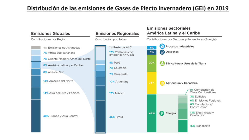 Las ciudades de ALC son las responsables de la mayor parte de las emisiones de gases de efecto invernadero (GEI) de la región, debido a la alta concentración de población (80% del total), la actividad industrial y el alto consumo energético. Estos gases, a su vez, son uno de los principales causantes del calentamiento global. El Acuerdo de París de 2015 sobre el cambio climático, estipulaba como objetivo mantener el aumento de la temperatura global muy por debajo de 2°C o en 1,5 °C por encima de los niveles preindustriales. Sin embargo, la realidad es que, al ritmo actual, no lograremos cumplir esa meta. Es por ello por lo que se necesita la acción coordinada a todos los niveles de gobierno (desde el local al internacional), para conseguirlo.