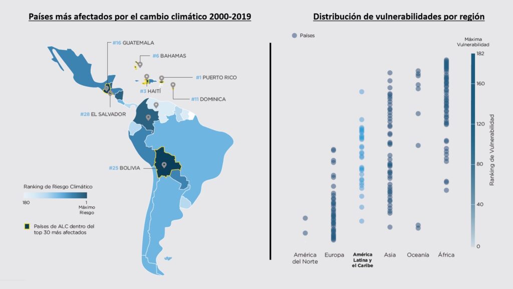 Fuente: Acción climática y Acuerdo de París: el rol de las ciudades de América Latina y el Caribe. (izda) Elaboración propia a partir de datos de Germanwatch, Indice de Riesgo Climático 2021 | (dcha) Elaboración propia a partir de datos de ND-GAIN: Índices de vulnerabilidad para el 2020.