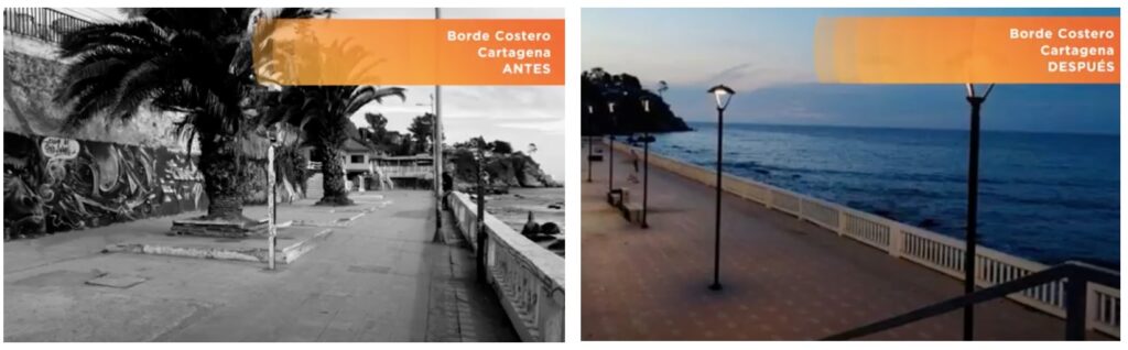 Como también se mencionó en el primer artículo de esta serie, cada uno de los barrios que participan en el programa desarrolla un Plan de Revitalización Barrial (PRB). La visión del Plan de Revitalización del polígono de Cartagena consiste en transformar este barrio histórico en un balneario limpio, ordenado e inclusivo. Para ello, un paso importante es la recuperación de su borde costero a partir de terrazas, ciclovías y miradores que motiven tanto a residentes como visitantes a disfrutar la belleza paisajística que ofrece este barrio durante todo el año. El proyecto para recuperar el borde costero consiste en el mejoramiento y habilitación de la terraza ubicada entre Playa Grande y Playa Chica, la cual se encuentra inmersa dentro de la zona típica y tiene grandescualidades y calidades espaciales arquitectónicas.