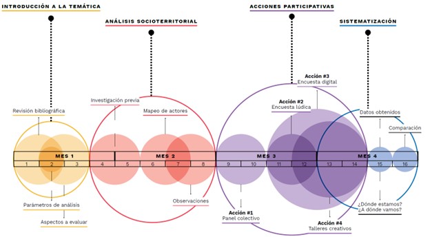 - Análisis socio-territorial, que consiste en hacer un primer levantamiento de la información demográfica, mapeo de actores y observaciones que permitan comprender las dinámicas del área en mayor profundidad.