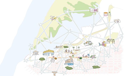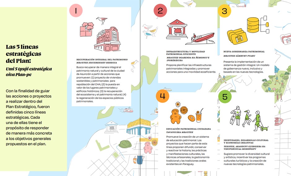 Mapa con elementos patrimoniales en el Centro Histórico de AsunciónEl desarrollo del programa consistió, primero, en la construcción del perfil de ciudad y su centro histórico. Después se abordó una fase analítica, asociada al diagnóstico del área de intervención acompañado con una visión compartida, producto de talleres participativos. Finalmente, se formuló el plan conocido como “El Ñanduti: Plan Estratégico para el CHA”. Este plan comprende cinco líneas estratégicas y 76 proyectos que funcionan a modo de red en el territorio de manera homogénea. Para ello, se tuvo en cuenta que cada zona tendría edificios, espacios, corredores e infraestructura para el desarrollo y potencialización del patrimonio material, natural e inmaterial. Además, se analizó y evaluó el impacto, viabilidad y presupuesto de cada uno de los proyectos.