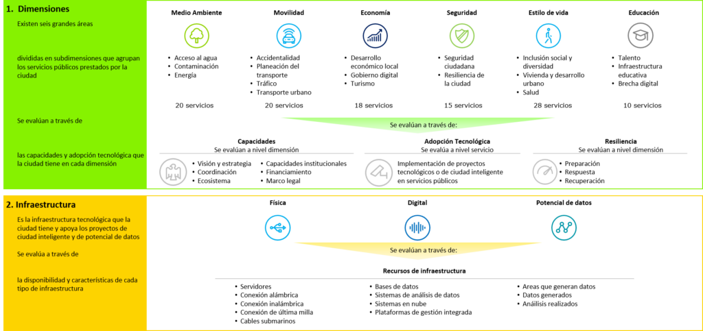 - DIMENSIONES: éstas definen 6 grandes áreas funcionales mediante las cuales se gestionan los servicios de la ciudad inteligente: medio ambiente, seguridad, educación, economía, movilidad y estilo de vida. A su vez, se dividen en subdimensiones, y se utilizan para evaluar: el grado de adopción tecnológica en dichos servicios, las capacidades locales para la identificación, planeación y desarrollo de proyectos, y la resiliencia de la ciudad para prestar servicios.