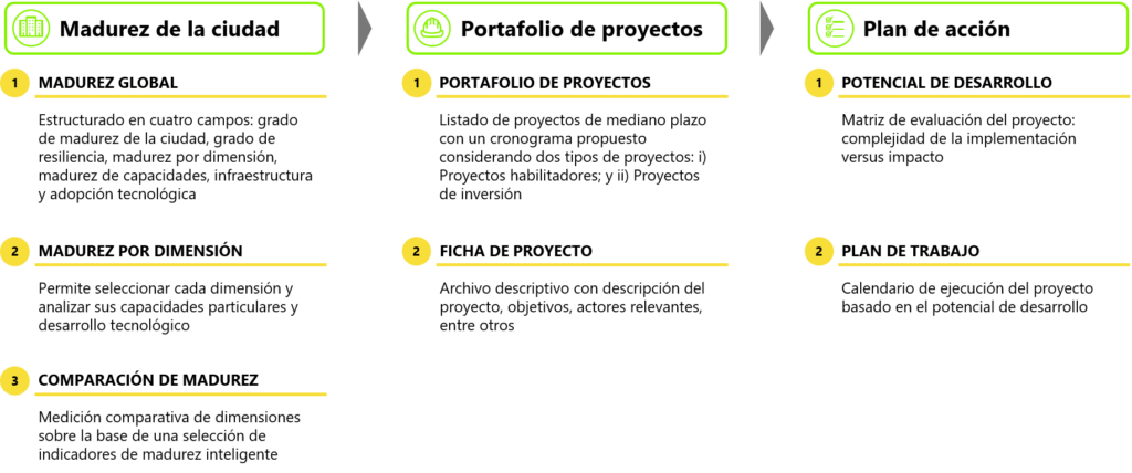 Después de aplicar la metodología, las ciudades tienen la oportunidad de identificar su nivel de madurez. Tras esto, pueden elegir proyectos específicos que le permitan mejorar dicha madurez como ciudad inteligente, así como formular un plan de acción a mediano plazo para implementar los proyectos.