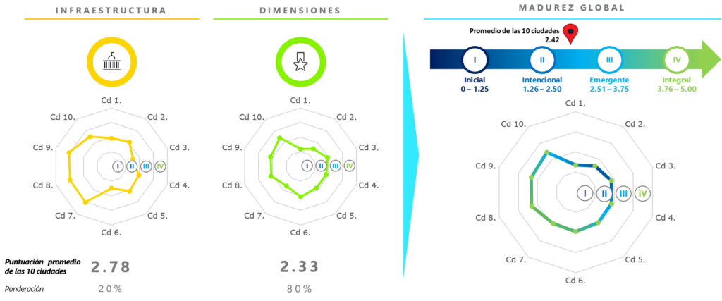 El BID, ha implementado esta metodología en 10 ciudades de todo ALC. Como resultado, se ha identificado que, en promedio, las ciudades evaluadas presentaron una madurez global de 2.42, colocándolas en un Nivel II (intencional) con fortalezas en la infraestructura: