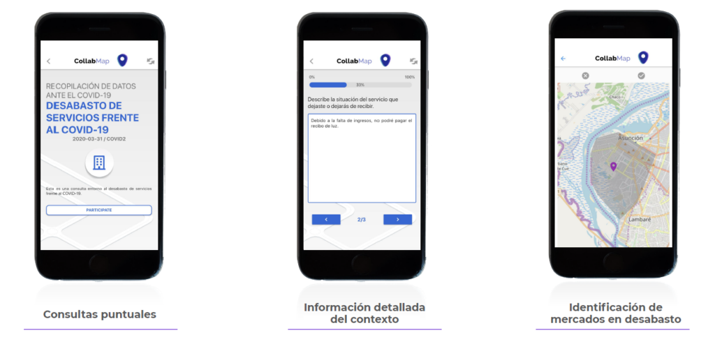 Colabmap cuenta con una aplicaciónmóvil para monitorear información en barrios informales sobre el estado de salud, servicios básicos, empleo, seguridad alimentaria, hacinamiento, entre otras variables críticas. Además, permite conocer, tabular y georreferenciar demandas en una determinada región para temas previamente configurados, por medio de consultas realizadas por el teléfono o la web. Esta información se visualiza en mapas de calor o Hot Spots, donde se identifican los lugares dentro de la comunidad que concentran problemas y demandas específicas.