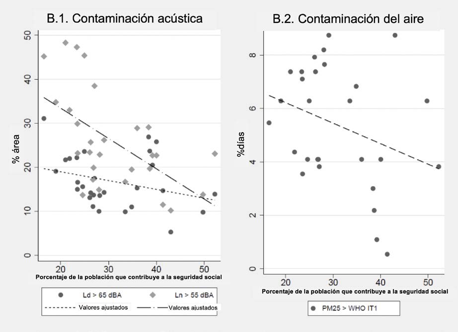 El gráfico 1, panel A.2, muestra que las comunas más ricas, medidas por el ingreso per cápita de los hogares, están menos expuestas a altos niveles de contaminación del aire. Sin embargo, no encontramos evidencia del mismo patrón para la contaminación acústica (Panel A.1 de la Figura 1). Asimismo, las comunas con un mayor porcentaje de población que cotiza a la seguridad social (un indicador de empleo formal), otro indicador de un mayor nivel socioeconómico, están menos expuestas a la contaminación atmosférica y acústica (véanse los paneles B.1 y B.2 de la figura 1).
