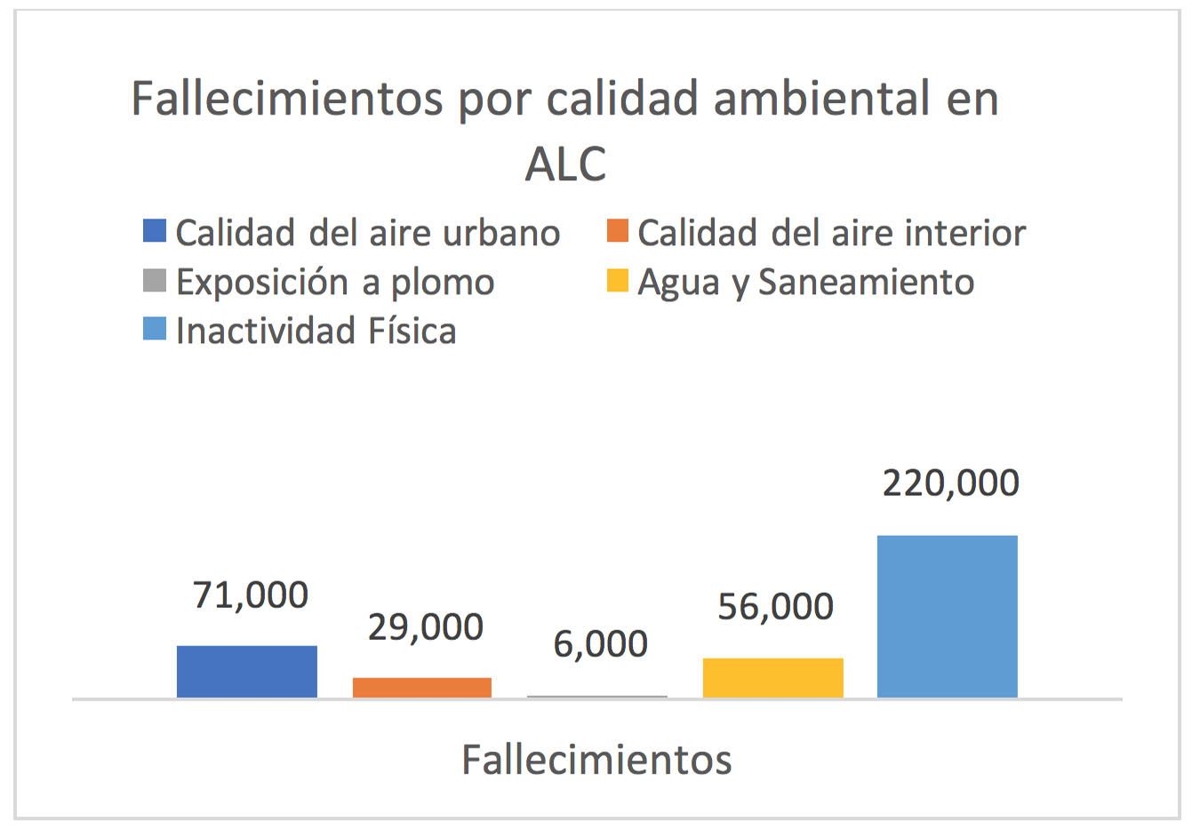 Figura 1b. Fallecimientos en ALC por causas ambientales. Fuente: Elaboración propia con datos de: WHO (2009). Global health risks: mortality and burden of disease attributable to selected major risks. Global Health Organization. ISBN 978 92 4 156387 1. Geneva, Switzerland.