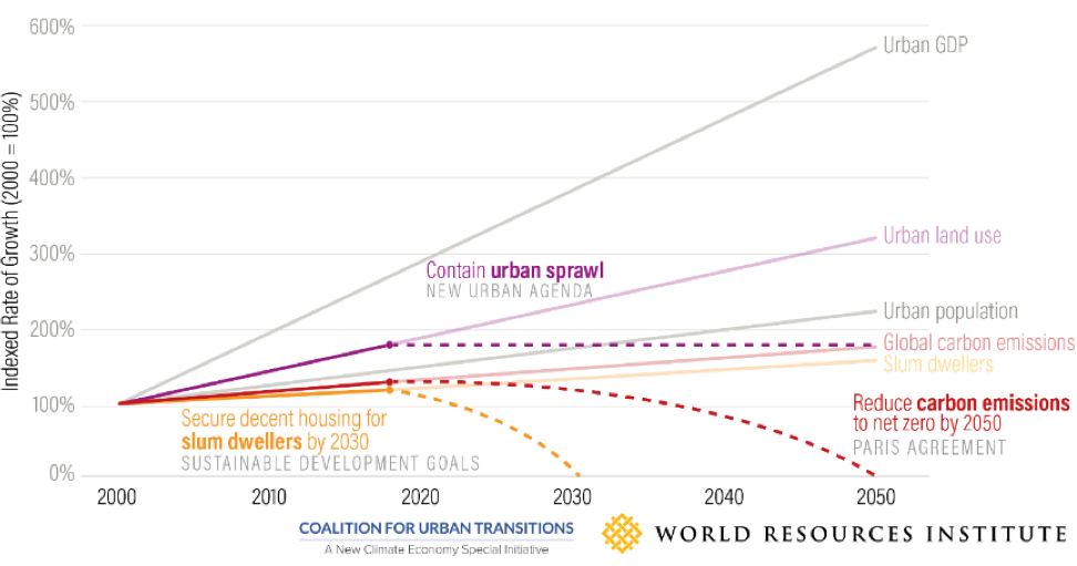 FIGURA 1: El gráfico ilustra la trayectoria a 2050 de indicadores seleccionados y lo que se necesita para conseguir metas globales (de desarrollo y cambio climático). PIB urbano es el PIB de las 750 ciudades más grandes. Un aumento en la mancha urbana es casi inevitable pero debería ser gestionado y minimizado. Las emisiones netas globales se usan como proxy de emisiones urbanas. El número de personas que viven en barrios informales incluyen solo países en desarrollo.A pesar de la desaceleración económica provocada por la pandemia, se espera que la urbanización siga aumentando. En ALC, las grandes ciudades, ya consolidadas, aún tienen desafíos de infraestructura y brechas latentes derivadas de su expansión rápida y no planificada desde la década de los 50. Uno de los principales obstáculos en este sentido es la elevada tasa de informalidad, que tiene consecuencias en el perfil energético y de movilidad de las ciudades. Por otra parte, se espera que las ciudades medianas y las del Caribe sigan creciendo, por lo que es importante tomar en cuenta las lecciones aprendidas de las grandes metrópolis de la región.