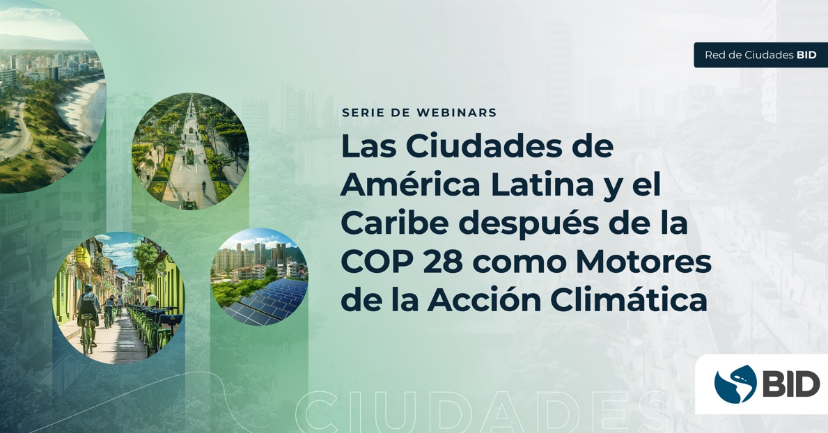 A través de la serie de webinars "Las Ciudades de América Latina y el Caribe después de la COP28 como Motores de la Acción Climática”, desde la Red de Ciudades del BID compartiremos herramientas para facilitar la acción climática local. Ahondaremos en la relevancia de la coordinación multinivel, la transversalización de la perspectiva de género y la promoción del financiamiento climático a nivel subnacional. Tu participación es vital para catalizar esta transformación en nuestras ciudades. Sigue leyendo para conocer más detalles.
