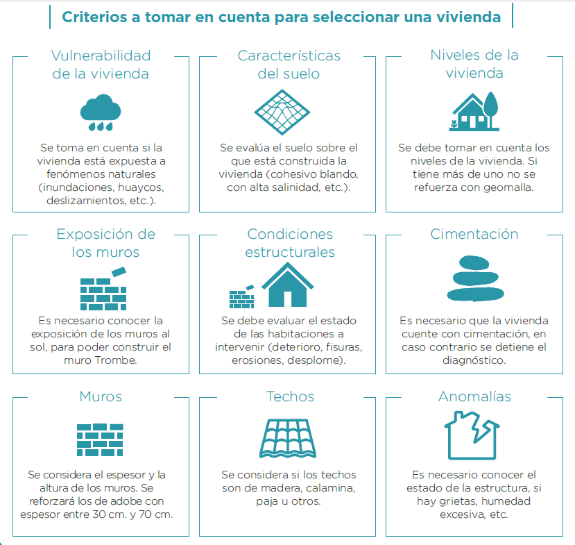 En la fase de diagnóstico, durante la cual el personal del programa visita las viviendas seleccionadas, se propuso evaluar las características territoriales, tales como el relieve (si las viviendas están ubicadas en zonas montañosas o en pampas con pendiente ligera), la disponibilidad de materiales en la zona, la actividad económica a la que se dedica la familia (las necesidades de las viviendas varían según se dediquen a la agricultura, ganadería o comercio), y cómo están compuestos los hogares (número de personas, y si tienen o no hijos).