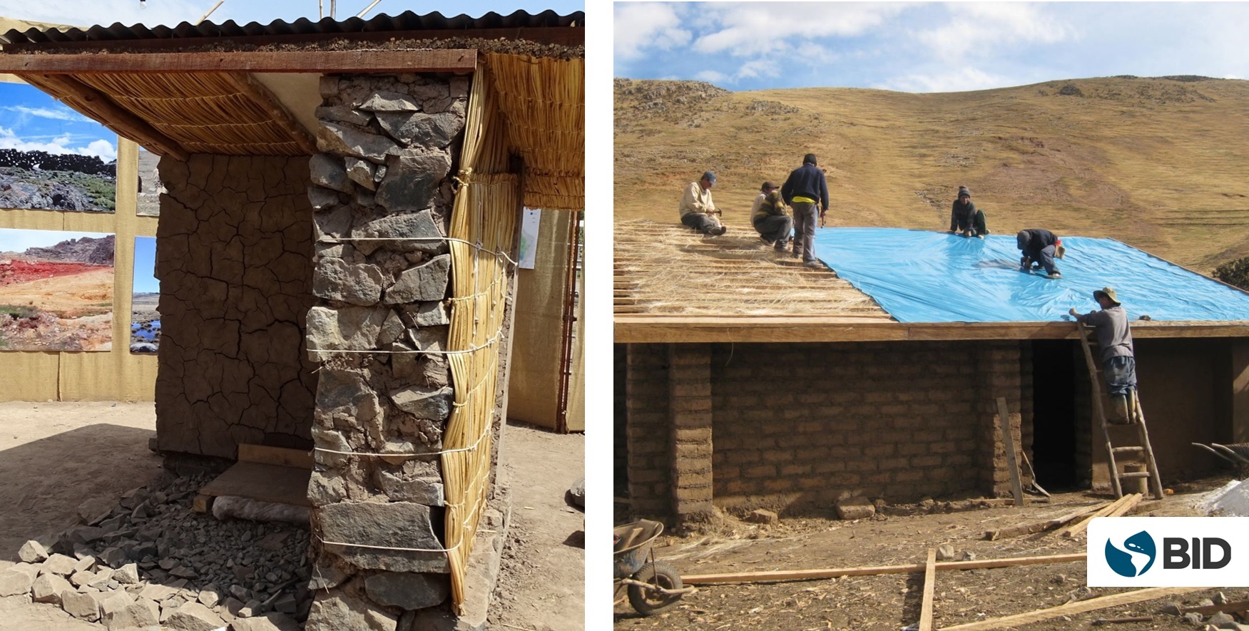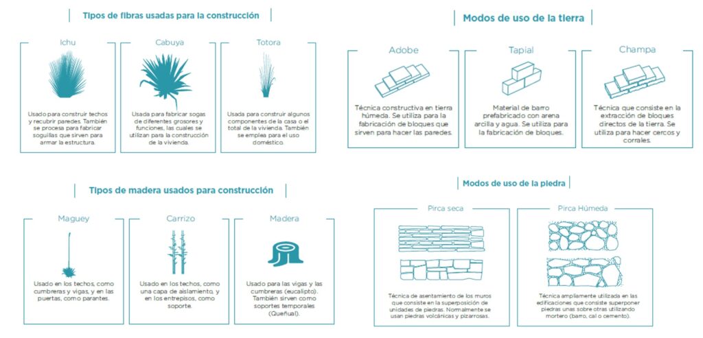 Otro aspecto que se propuso considerar durante la fase de diagnóstico fue el empleo de materiales y técnicas constructivas locales, limitando el uso de materiales industriales, lo cual reduce costos y tiempos requeridos, así como el impacto ambiental. Fibras naturales que se encuentran en los alrededores de la región como el ichu, la cabuya y la totora funcionan muy bien como aislantes térmicos en paredes, techos, puertas y ventanas. Igualmente, la madera local, como el eucalipto, la caña, el maguey, el kolle y el queñual pueden usarse para pisos, puertas, ventanas, vigas y cumbreras de los techos. También se sugirió utilizar tierra para fabricar materiales de construcción o para hacer revestimientos, dado que tiene un mejor comportamiento térmico que el yeso o el cemento, además de mantener la cualidad paisajística. Este enfoque de reacondicionamiento térmico pasivo, además de proteger de las heladas, tiene un efecto indirecto muy beneficio: permite a las familias gastar menos recursos en energía para calentar sus hogares.