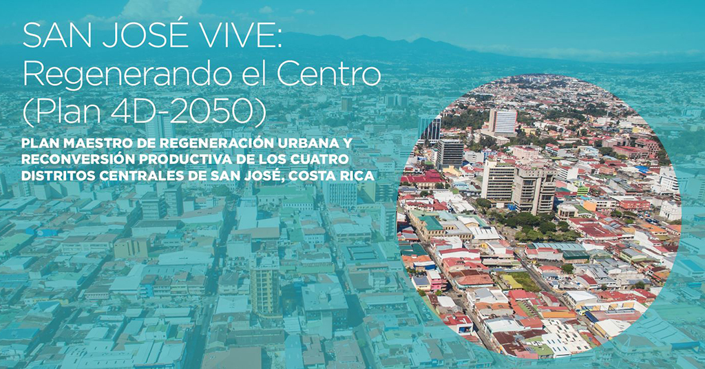 Figura 1. Intensidad del desarrollo de la huella urbana (aérea) del Área Metropolitana de San José en 1968, 2001 y 2013. Tomado del Plan de Acción San José Capital: de la Acción Local a la Sostenibilidad Metropolitana (BID, 2014, p. 55). En busca de una mayor sostenibilidad urbana en San José, desde 2016, el BID ayudó a formular el “Plan de Acción San José Capital: de la Acción Local a la Sostenibilidad Metropolitana”. El plan presentó alternativas innovadoras para responder a los costos sociales generados por el deterioro urbano, la urbanización extensiva y las crecientes demandas de los agentes urbanos. La primera prioridad del plan fue regenerar el centro urbano y la economía de San José. En el Plan 4D – 2050 en junio de 2019, la Municipalidad de San José presentó una propuesta de crecimiento urbano compacto e inteligente para el centro de San José. El Plan 4D - 2050 resulta del renovado interés de la Municipalidad de San José de incorporar en su gestión la mejora de la productividad y aprovechamiento del suelo urbano de sus cuatro Distritos Centrales (Merced, Carmen, Catedral y Hospital), los cuales han perdido población y funcionalidad como centro de la capital de Costa Rica. Así, el plan recoge, actualiza e integra la apuesta que desde hace casi tres décadas lleva impulsando la Municipalidad de San José, junto con otras instituciones y organizaciones públicas y privadas, para hacer del centro de la capital un lugar más habitable, sostenible y atractivo. El Plan 4D-2050 propone a través de un enfoque innovador, la reconversión productiva de la ciudad desde la regeneración urbana, entendiendo que no es posible revitalizar un área si no se actúa de forma coordinada y coherente en las tres dimensiones de la sostenibilidad: i) social, ii) urbano-ambiental y iii) económica. A partir del diagnóstico de la situación actual, el plan formula la Visión a 2050 para los 4 Distritos Centrales (4DC), que se concreta en el establecimiento de tres objetivos prioritarios: