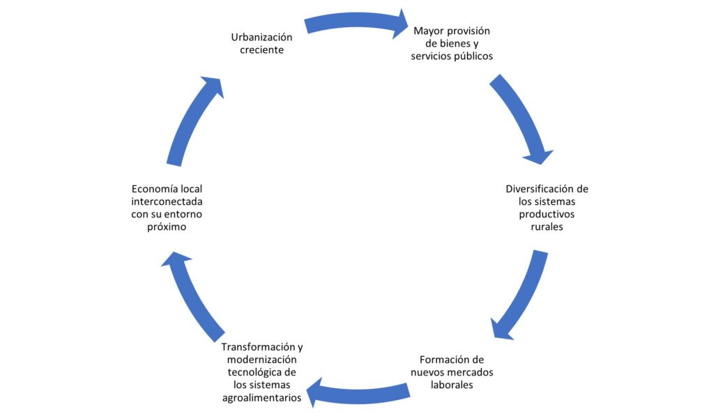 En esta dinámica de retroalimentación, la interdependencia territorial es absoluta: mientras las zonas rurales dinamizan las zonas urbanas, estos centros urbanos intermedios permiten que la transformación rural sea posible. Los vínculos que dan cuenta de la creciente interrelación entre áreas urbanas y rurales a partir de flujos de personas, bienes y servicios, son fundamentales para lograr que estas dinámicas de desarrollo rurales existan y puedan generar las condiciones para entrar en este ciclo de transformación estructural.