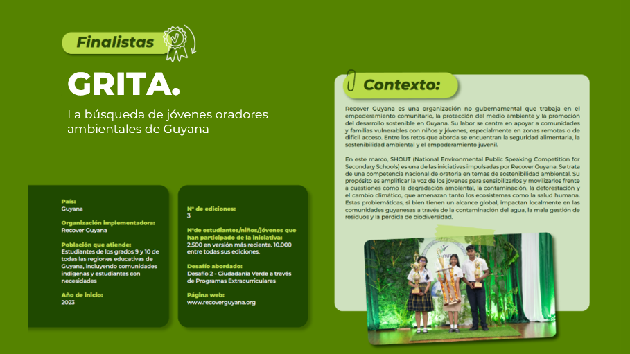 Aportan un valor único al complementar el aprendizaje en aula y potenciar el liderazgo juvenil en contextos locales, invitando a niñas, niños y jóvenes a convertirse en agentes de cambio en sus comunidades. Entre las experiencias se encuentra SHOUT, de Guyana, una competencia nacional de oratoria ambiental que empodera a estudiantes de secundaria como líderes juveniles, promoviendo propuestas sostenibles para transformar sus escuelas y comunidades. También destaca Me Sumo, de Chile, que impulsa la educación ambiental y la gestión de residuos en escuelas, combinando prácticas sostenibles, metodologías activas y participación comunitaria