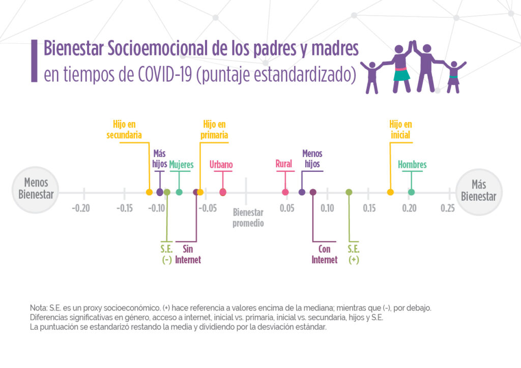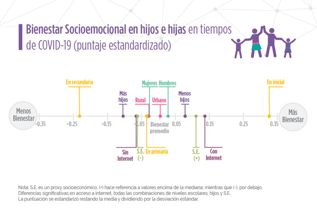 Las adolescentes en nuestra muestra han reportado un menor bienestar que sus pares masculinos. Esto puede ser resultado de que las adolescentes asuman más responsabilidades domésticas. Aunque no incluimos esta pregunta en nuestra encuesta, durante la pandemia en Ecuador, las niñas adolescentes participan en menos actividades de ocio y más tareas domésticas que los niños. El momento difícil que enfrentan los adolescentes durante el encierro es reflejado en sus padres, quienes también reportaron niveles más bajos de bienestar que los padres de niños más pequeños.