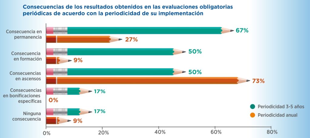 Por otro lado, los sistemas educativos con evaluaciones que tienen periodicidad entre 3 a 5 años atan los resultados de las evaluaciones obligatorias periódicas a decisiones de permanencia, ascensos, y a programas de formación.