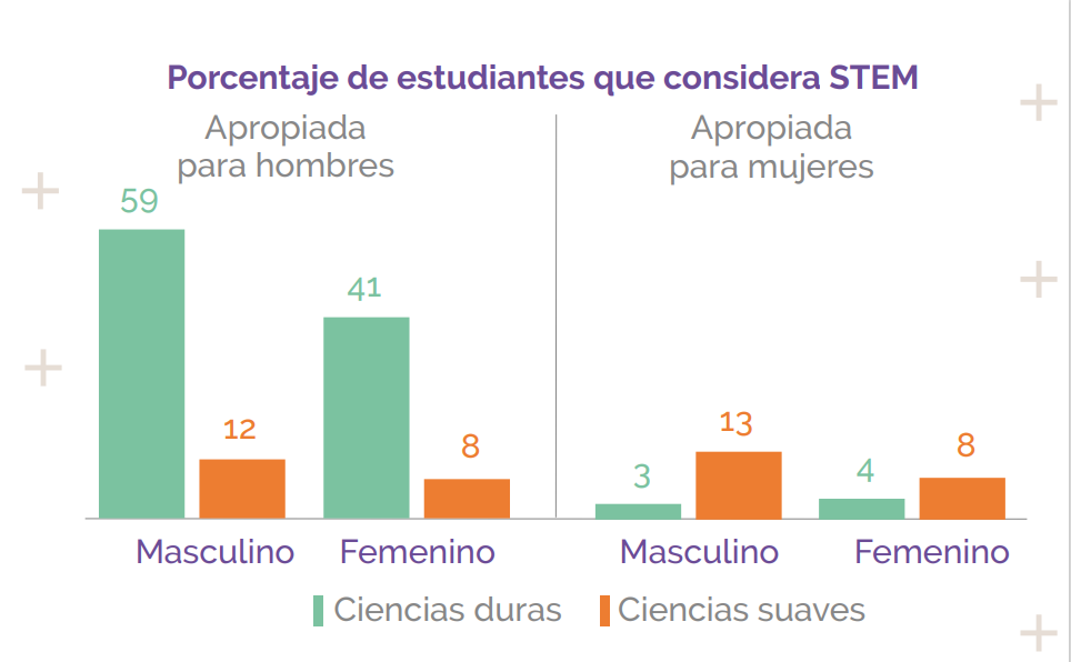 Tanto los y las jóvenes encuentran más aceptable que las mujeres sigan carreras en "ciencias blandas" como la biología y la medicina. Mientras el 11% de los hombres y el 8% de las mujeres encuestadas creen que es apropiado que las mujeres trabajen en campos correspondientes a las “STEM suaves”. Solamente de 3 a 4% de los estudiantes creen que es apropiado que las mujeres trabajen en las “STEM duras”. En contraste, de 50 a 60% creen que los hombres pertenecen a este campo.