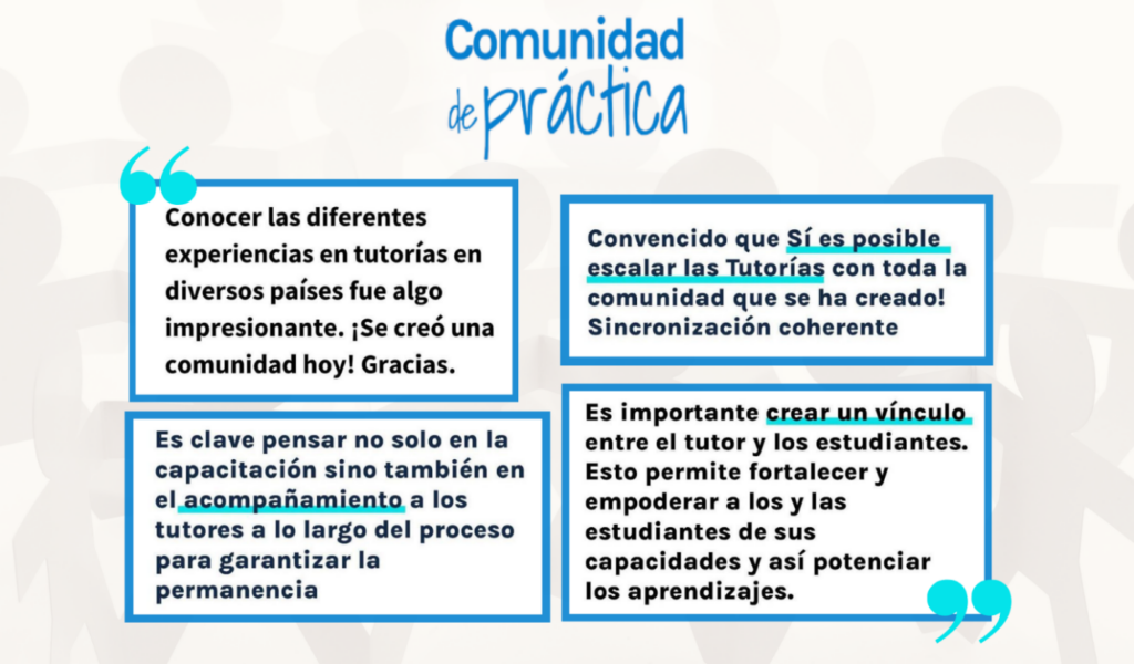 Una comunidad de prácticas es un espacio para aprender con los otros. Para compartir experiencias sobre los programas de tutorías remotas, que están demostrando tener gran capacidad para recuperar aprendizajes en América Latina y el Caribe, se desarrolló la comunidad de práctica de tutorias. Durante tres encuentros, 40 participantes de 26 diferentes organizaciones de tutorías remotas en la región sistematizaron lo aprendido sobre temas centrales como la selección de tutores y su capacitación, los vínculos con los estudiantes y las posibilidades de escalar estas iniciativas.