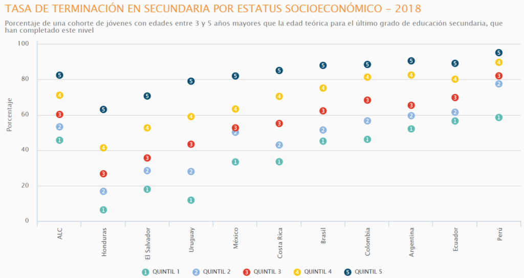 Esto viene a agravar la situación en la región: la interrupción de las trayectorias educativas ha sido, desde antes de la pandemia, uno de los problemas más urgentes y vigentes de los sistemas escolares en América Latina. De acuerdo con la plataforma de datos CIMA, en promedio uno de cada cinco jóvenes entre los 15 y 17 años – una de las fases más críticas para la permanencia o abandono escolar – no asistía a un centro educativo en el año 2018. Además, si bien la tasa de terminación en secundaria es de 64%, se evidencia una marcada diferencia por nivel socioeconómico de hasta más de 50 puntos porcentuales entre estudiantes pobres (quintil 1) y ricos (quintil 5) (ver gráfico).