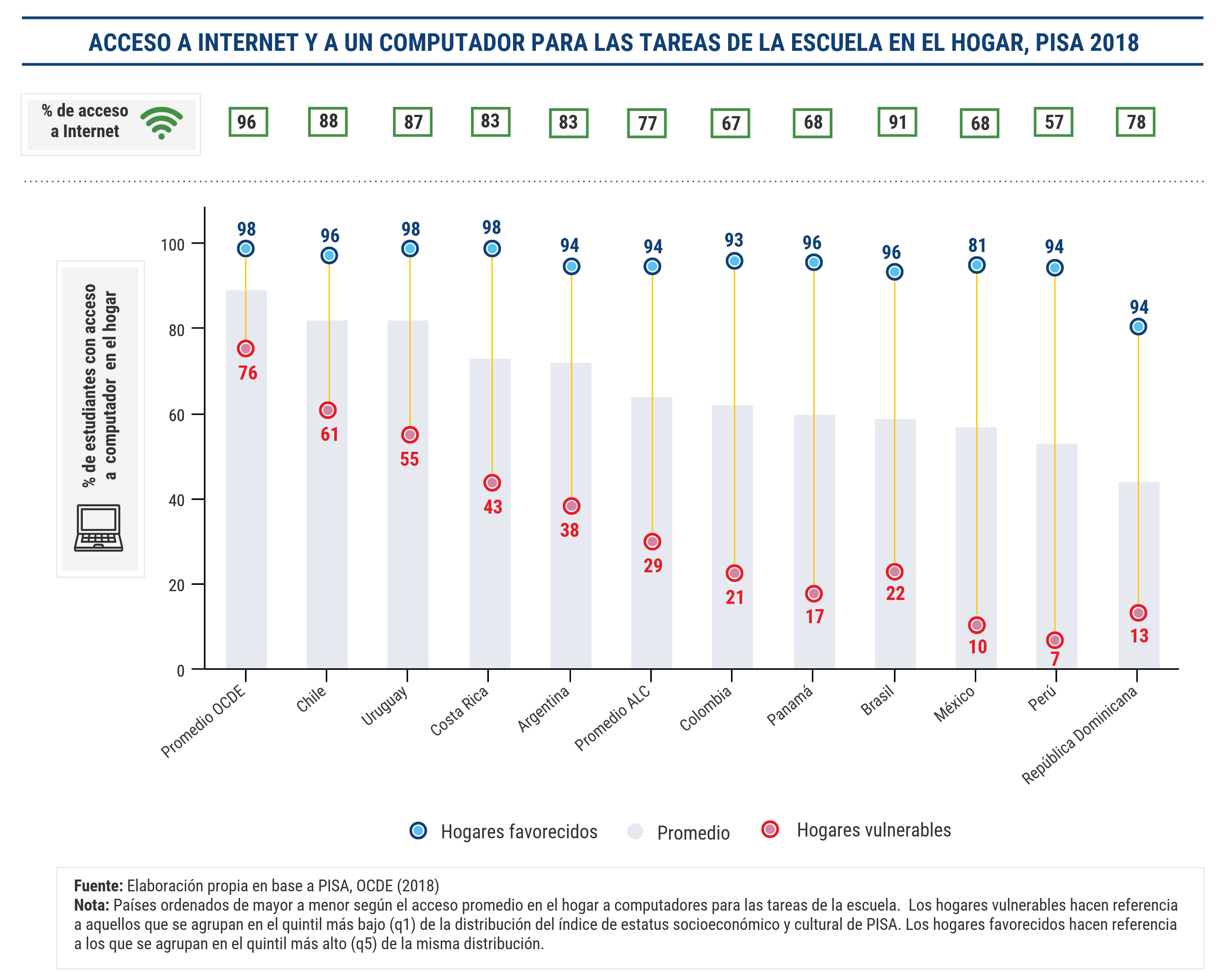 Aprendizaje desde casa En los países de América Latina y el Caribe se han combinado distintos canales de educación a distancia como respuesta inmediata para entregar contenido a los estudiantes, incluyendo plataformas digitales, televisión, radio y material impreso. ¿Qué tanto podemos esperar de estas estrategias para garantizar el aprendizaje durante e incluso después de la emergencia? Los datos nos dicen que, no en todos los países y no para todos los estudiantes las soluciones pueden funcionar de manera equitativa. Al considerar plataformas digitales, que son herramientas que permiten una interacción y monitoreo de los aprendizajes en tiempo real, surgen dos aspectos. Uno es que el desarrollo y la implementación exitosa de cualquier solución digital es un proceso que requiere grandes esfuerzos. Antes de la emergencia, muchos países no contaban con las condiciones digitales de base para brindar educación en línea (ver Nota CIMA) y mucho menos ahora cunado los ministerios de educación no están operando en su capacidad regular. El segundo aspecto es que estas herramientas difícilmente llegan a las poblaciones más vulnerables. Estudios en educación primaria y secundaria han evidenciado la baja incorporación de herramientas digitales en los procesos de enseñanza y aprendizaje. Además, la inequidad en el acceso a tecnología, conectividad y recursos digitales muestra que la mayoría de los estudiantes de la región no cuentan con las condiciones tecnológicas para aprender en línea desde casa (ver Nota CIMA). Por ejemplo, en América Latina menos del 30% de los hogares más vulnerables tienen acceso a un computador en el hogar para las tareas de la escuela. Además, el internet uno de los requisitos para las soluciones de aprendizaje en línea, pero muy pocos países en la región cuentan con acceso generalizado.