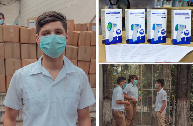 Termometros infrarojos y jóven en su escuelaEste programa ayudó a materializar las estrategias de retorno seguro a clases de El Salvador y Honduras con la entrega de insumos priorizados para iniciar el proceso de reapertura de sus escuelas, apoyando a los jóvenes más vulnerables para disminuir el impacto del cierre de las escuelas en sus aprendizajes.