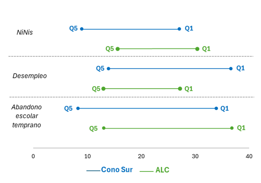 El estudio muestra que los promedios esconden importantes desigualdades, con peores resultados para los jóvenes de hogares pobres y vulnerables, las mujeres (que afrontan una carga mayor de trabajo de cuidados o doméstico no remunerado), y los jóvenes indígenas y afrodescendientes. Por ejemplo, la figura muestra que la proporción de NiNis, el desempleo, y el abandono escolar en el quintil de menores ingresos (Q1) es aproximadamente 3 veces mayor que en el quintil de mayores ingresos (Q5), siendo estas brechas mayores que en el promedio de los países de América Latina y el Caribe.