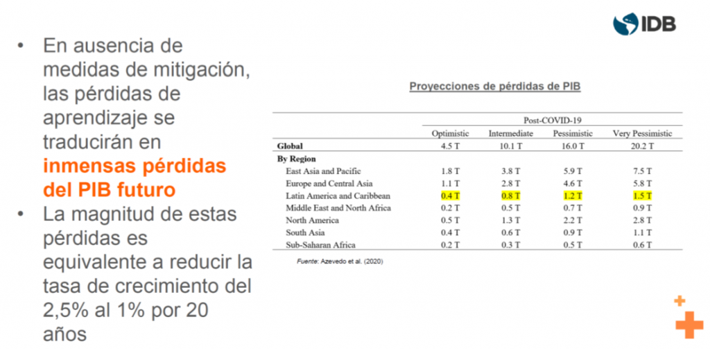Descuidar la educación en estos momentos implica retroceder, por lo que no hay prioridad más importante para los países de la región que tratar de minimizar las consecuencias de la pandemia. Algunas estimaciones muestran que, en ausencia de políticas efectivas para limitar el impacto de la pandemia sobre el aprendizaje, los costos de la pandemia para América Latina ascenderían a aproximadamente 28% del PIB futuro.El Fondo Monetario Internacional estima que, para el 2019, el PIB de la región cayo en 8% - la mayor caída del ingreso jamás observada en la región. De esta forma el costo a largo plazo de la caída en la productividad laboral podría ser casi 4 veces mayor.